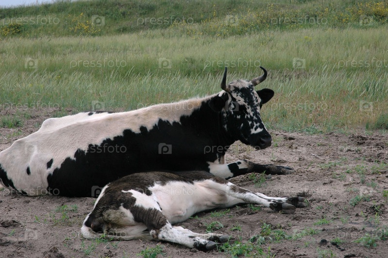 Корова с теленком лежит на траве