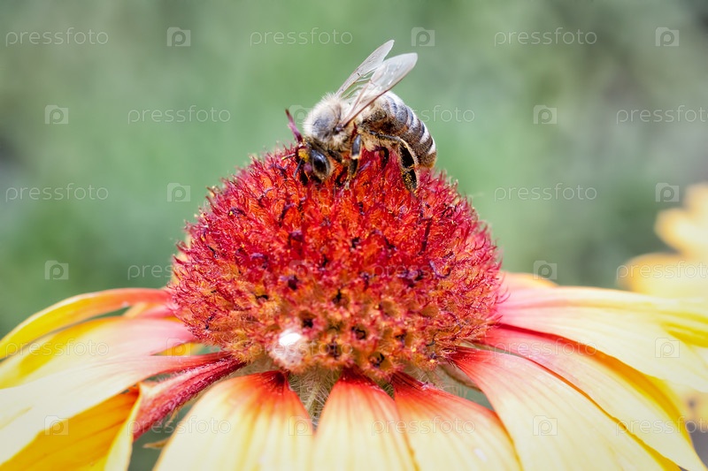 Пчела собирает нектар на красно-желтом цветке