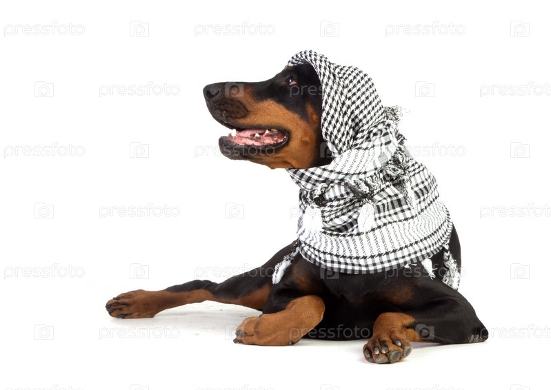 Собака породы доберман в черной куфии