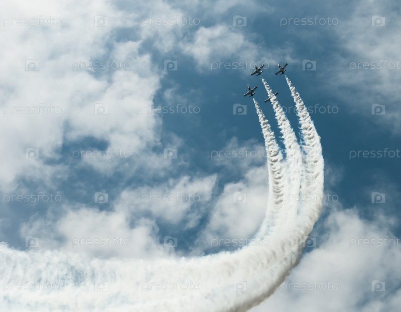 Звено самолетов выполняет фигуру высшего пилотажа в грозовом небе