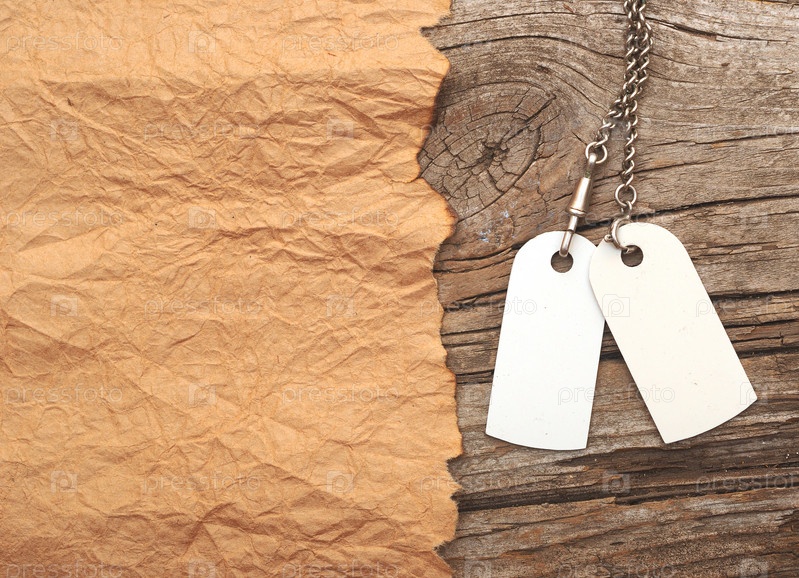 Пустые бирки с серебряной цепочкой на винтажном фоне, пространство для текста
