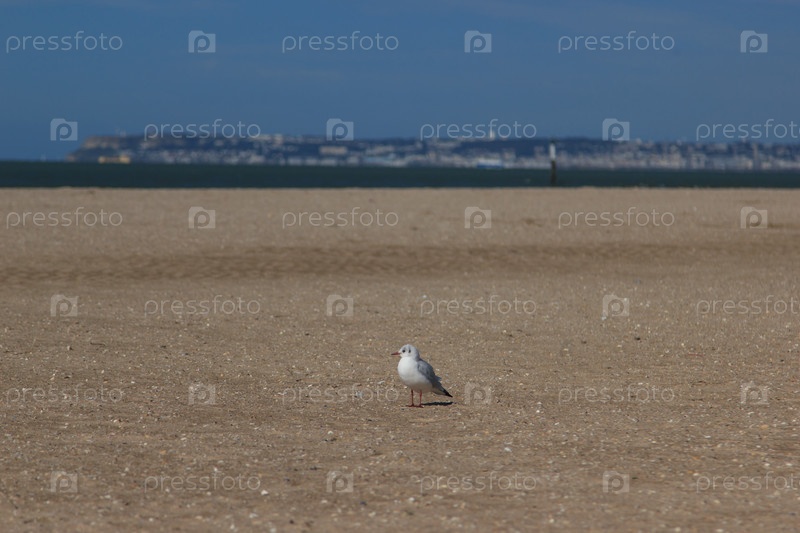 Довиль. Песчаный пляж. Чайка сидит на берегу Ла-Манша
