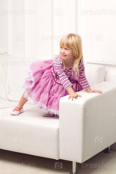 Маленькая девочка с удовольствием позирует на диване