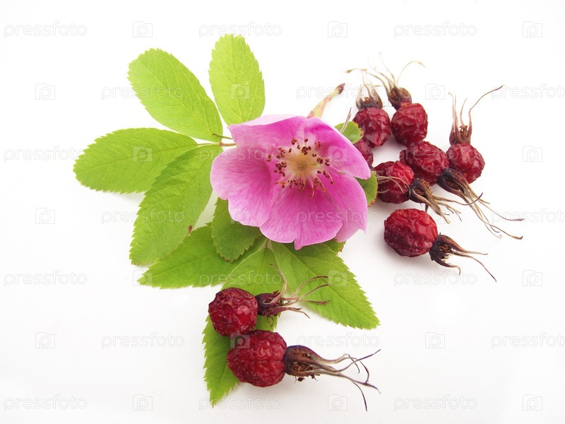 Розовый цветок шиповника и его плоды