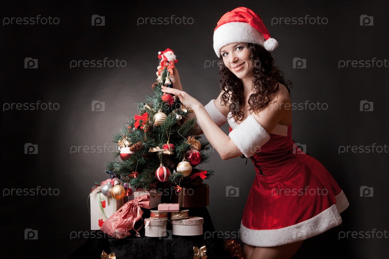 Девушка Санта украшает елку