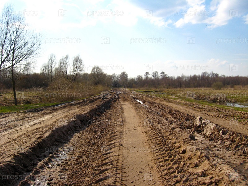 Сельская дорога со следами от автомобилей и грязью