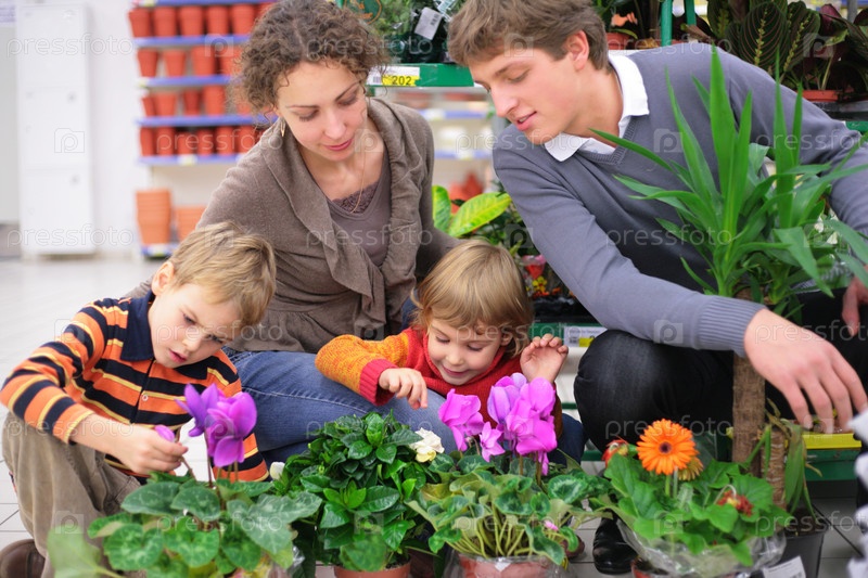Семья выбирает комнатные растения в магазине