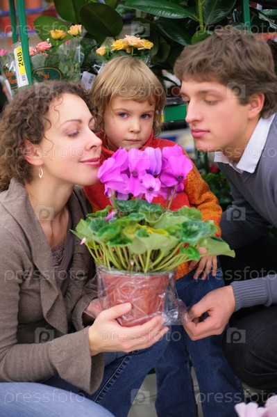 Семья выбирает комнатные растения в магазине