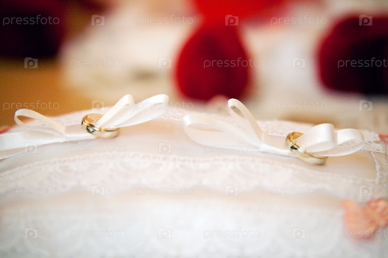 Золотые обручальные кольца на подушечке для булавок