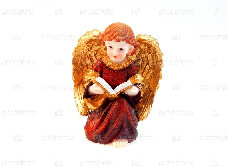 Статуэтка ангелочка с золотыми крыльями на белом фоне
