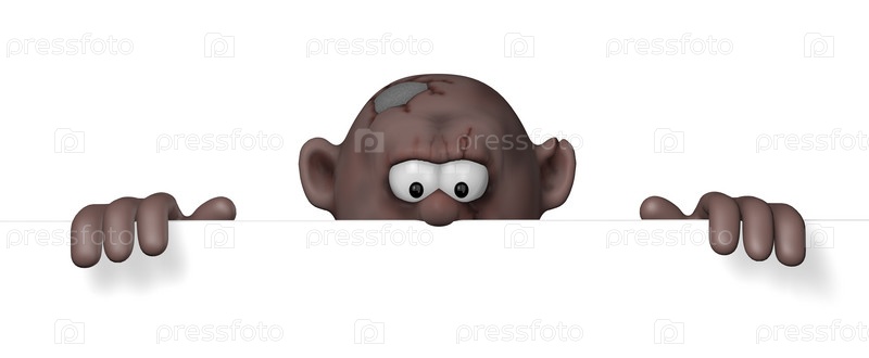 Мультипликационный персонаж смотрит на пустой белый баннер - 3d иллюстрация