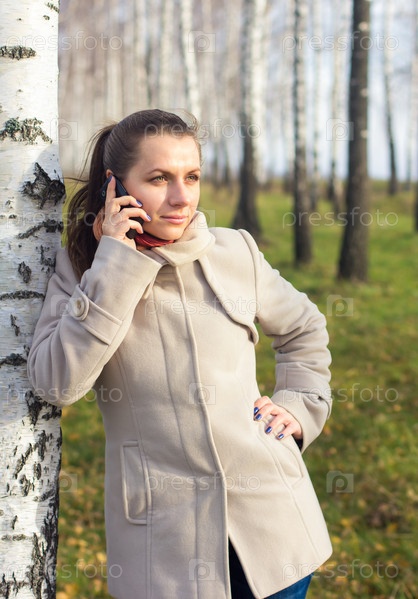 Портрет девушки с телефоном под березой