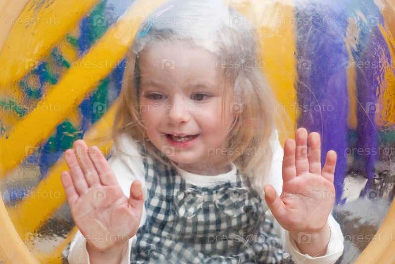Маленькая девочка за окном на детской площадке