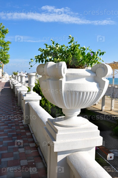Белый скульптурный горшок с цветами на перилах приморской набережной