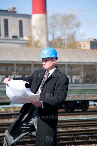 Инженер-стоитель в каске с чертежами в руках