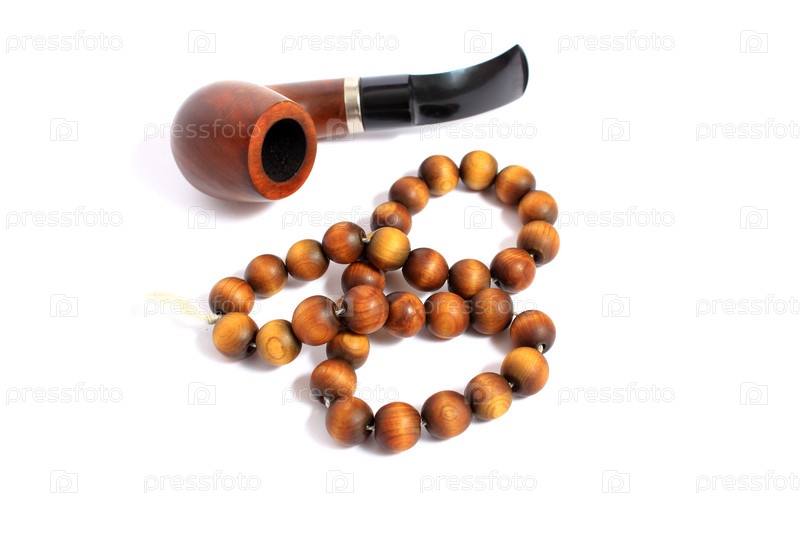 Ретро трубка для курения и четки изолированно на белом фоне