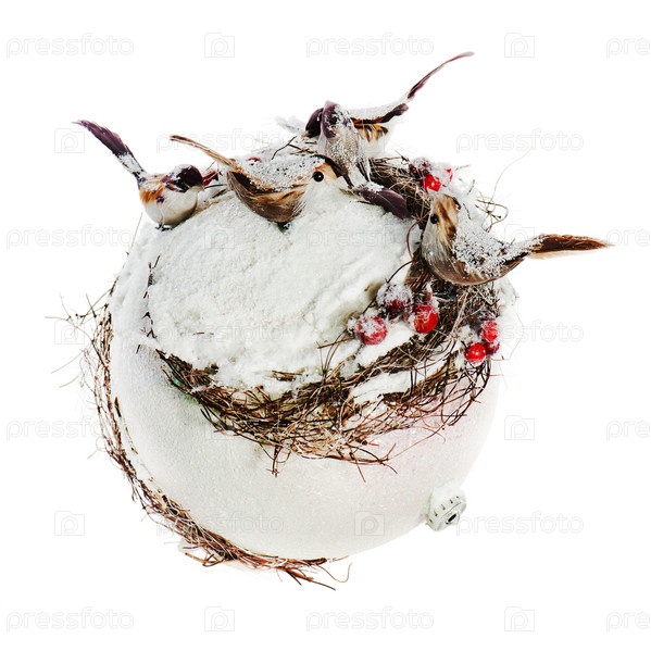 Новогодняя композиция из птиц, рябины, снега и белой сферы, изолированных на белом фоне