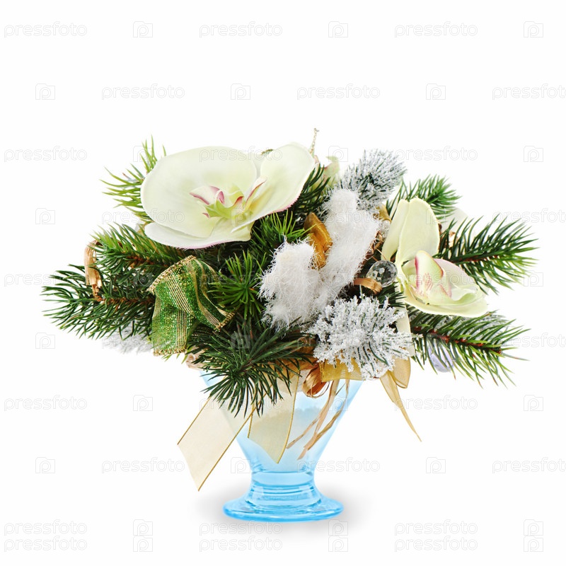 Рождественские шарики, орхидеи, снежинки, бусы и сосновые ветви, изолированные на белом фоне