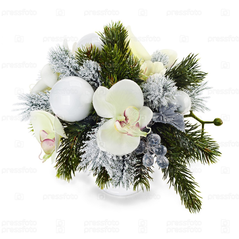Рождественские шарики, орхидеи, снежинки, бусы и сосновые ветви, изолированные на белом фоне