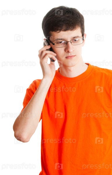 Молодой человек с телефоном на белом фоне