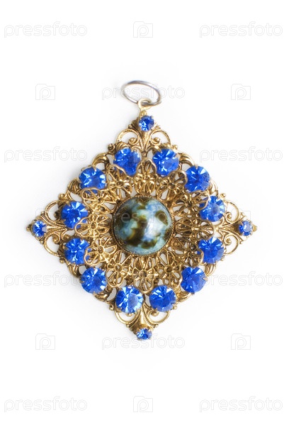 Женская подвеска из желтого металла и синего камня без цепи на белом фоне
