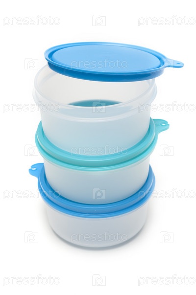 Набор круглых пластиковых контейнеров на белом фоне