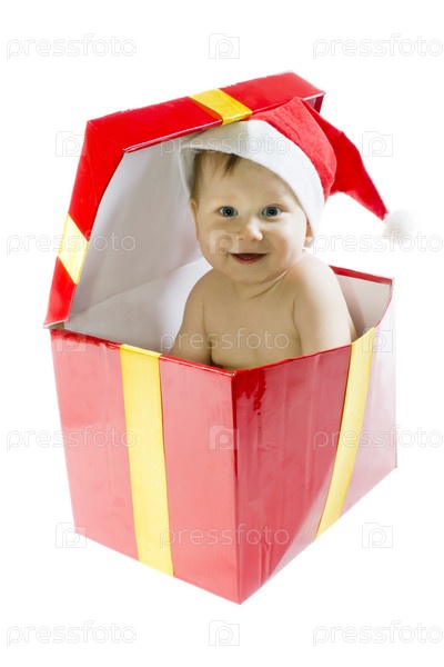 Малыш в колпаке Санта-Клауса, сидящий в подарочной коробке