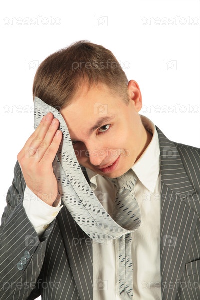 Уставший мужчина с галстуком на белом фоне, изолированный на белом фоне