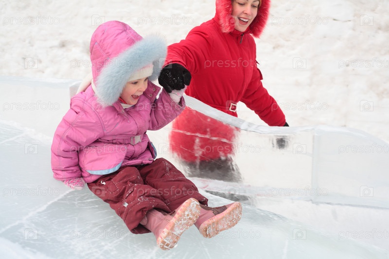 Маленькая девочка скатывается с ледяной горки с мамой