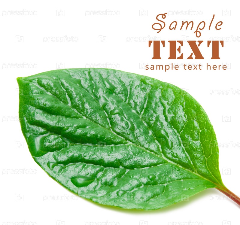 Зеленый лист с каплями росы на белом фоне