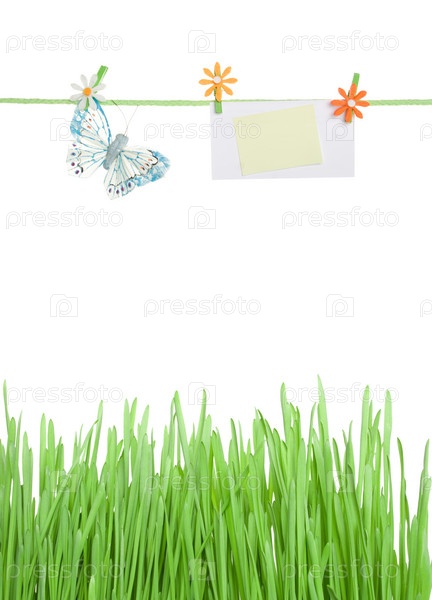 Зеленая трава,бабочка и бумажный листок на веревке