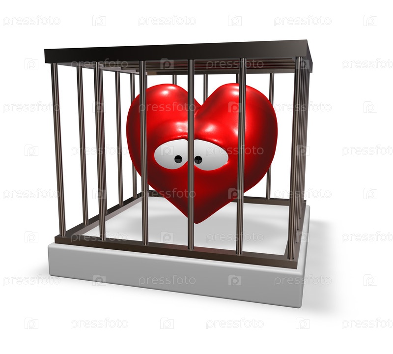 Металлическая клетка с красным грустным сердцем внутри - 3d иллюстрация