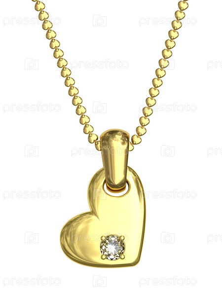 Золотой кулон в виде сердца с бриллиантом на цепочке, изолированный на белом фоне