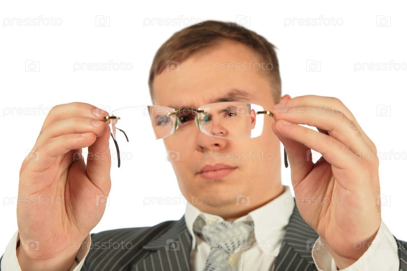 Человек рассматривает очки на белом фоне