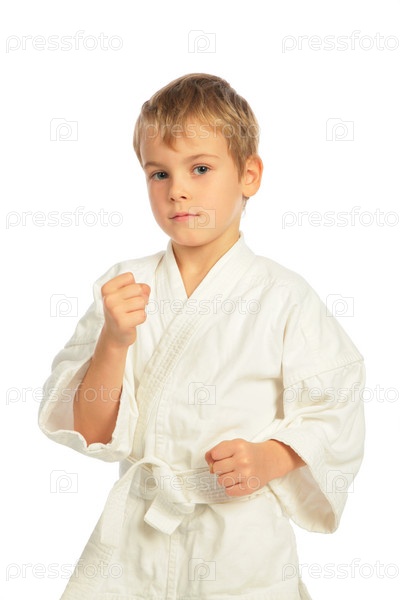 Мальчик в кимоно занимается карате