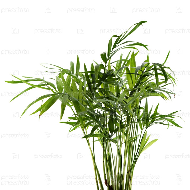 Растение хамедорея в зеленом горшке на белом фоне