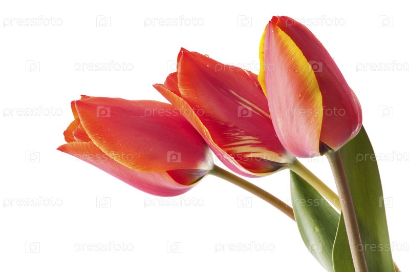 Букет красных тюльпанов с росой на белом фоне