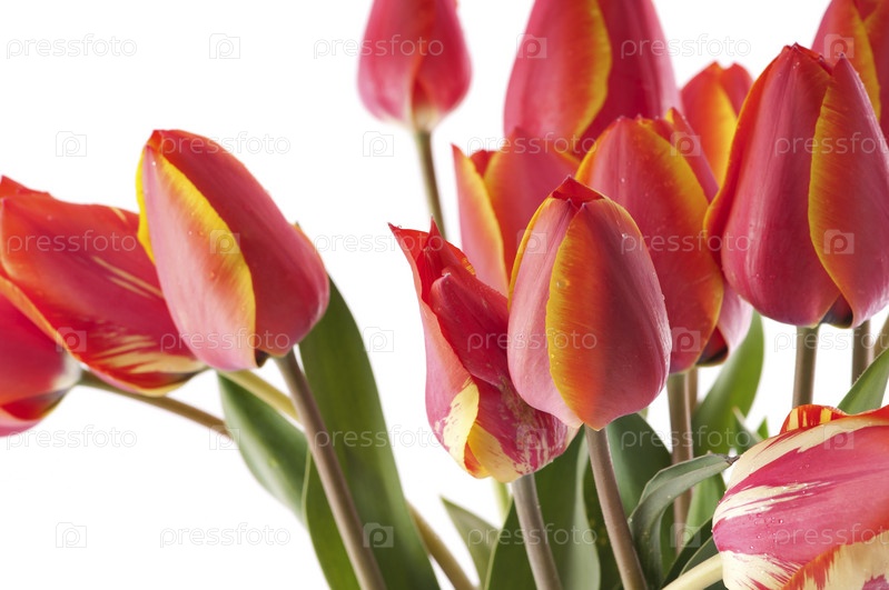 Букет красных тюльпанов с росой на белом фоне