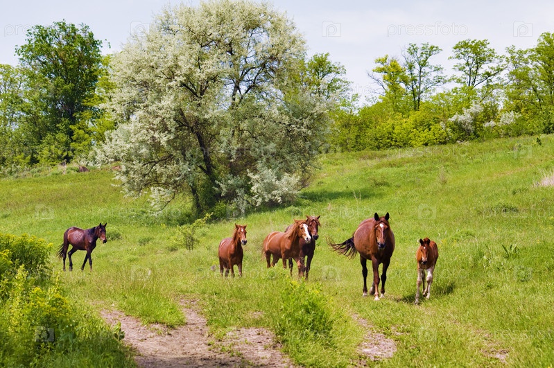 Табун пасущихся лошадей в дикой степи
