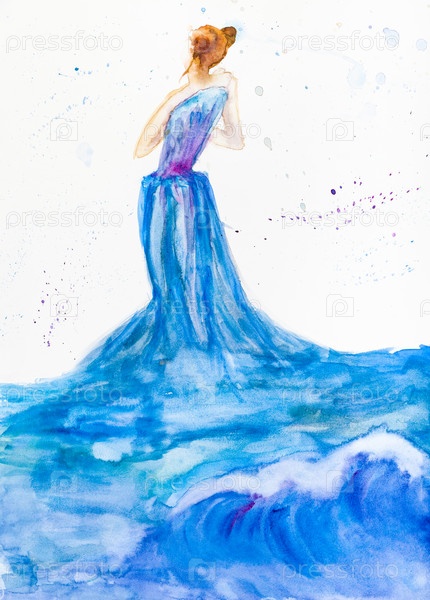 Женщина в голубом вечернем платье из воды океана