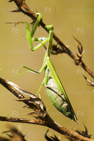 Зеленый богомол на сухом полевом цветке