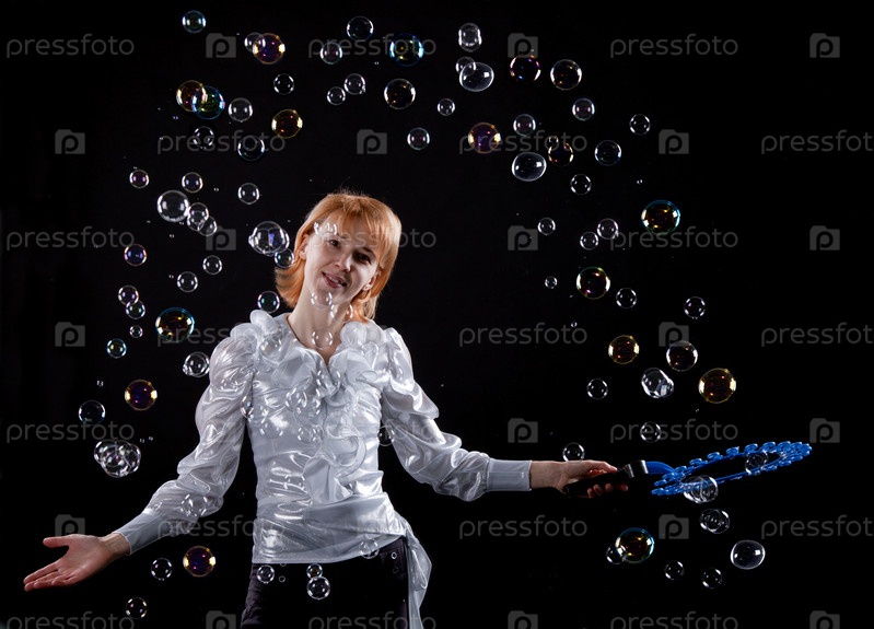 Девушка делает мыльный пузырь на черном фоне