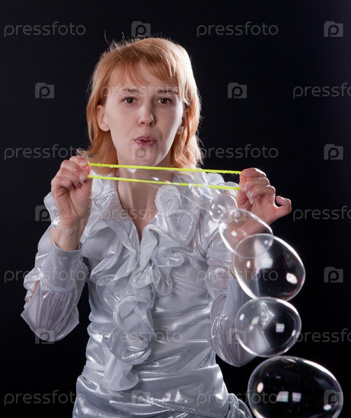 Девушка показывает шоу с мыльными пузырями на черном фоне