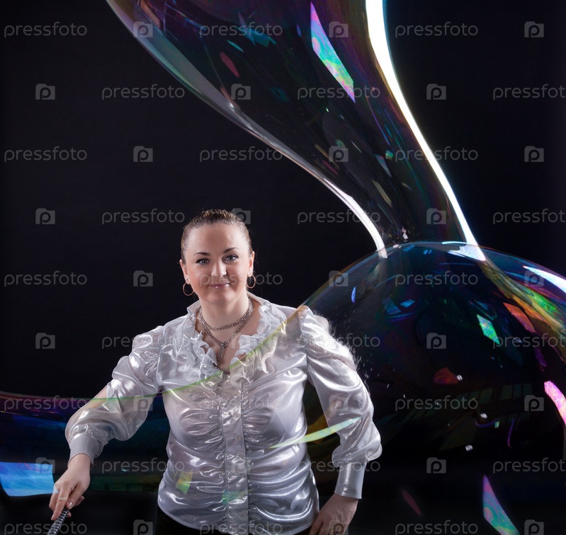 Девушка показывает шоу с мыльными пузырями на черном фоне