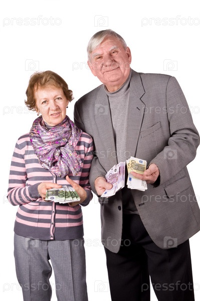 Пожилые супруги с деньгами в руках на белом фоне
