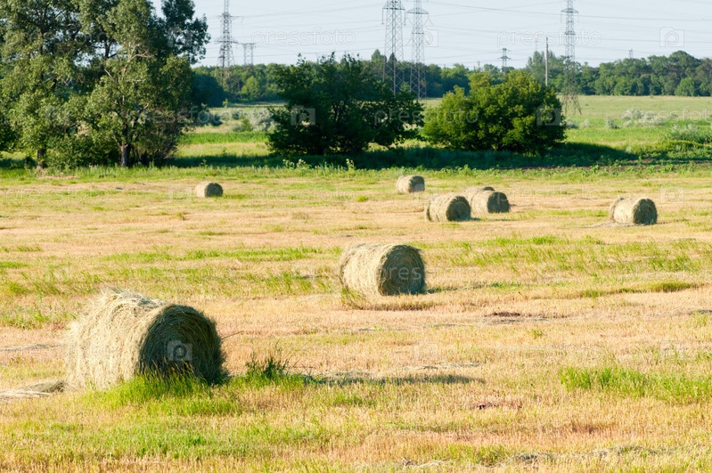 Сельский пейзаж с рулонами сена