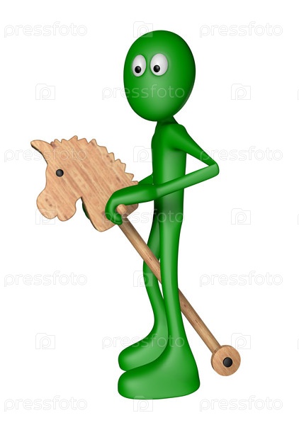 Маленький зеленый человек едет на игрушечной лошади - 3d иллюстрация
