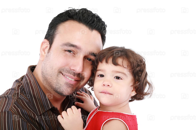 Красивый заботливый отец держит свою дочь на руках на белом фоне
