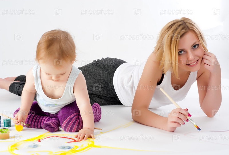 Хорошенькая молодая мать и дочь рисуют