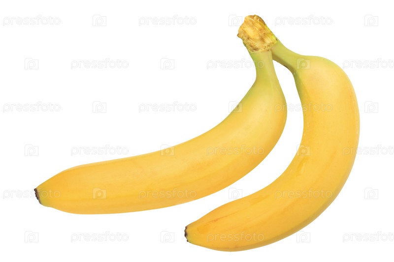 Два желтых банана крупным планом, изолированные на белом, студийная съемка